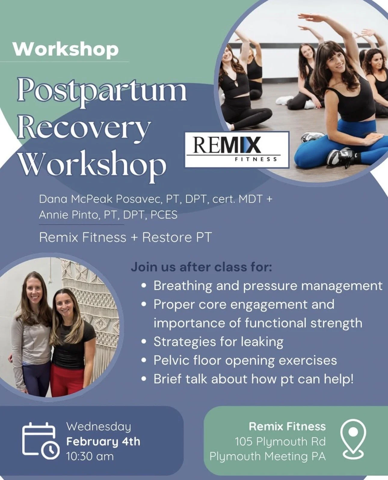 When: Wednesday, February 4th at 10:30am Where: Remix Fitness – 105 Plymouth Rd, Plymouth Meeting Who: Open to all postpartum bodies