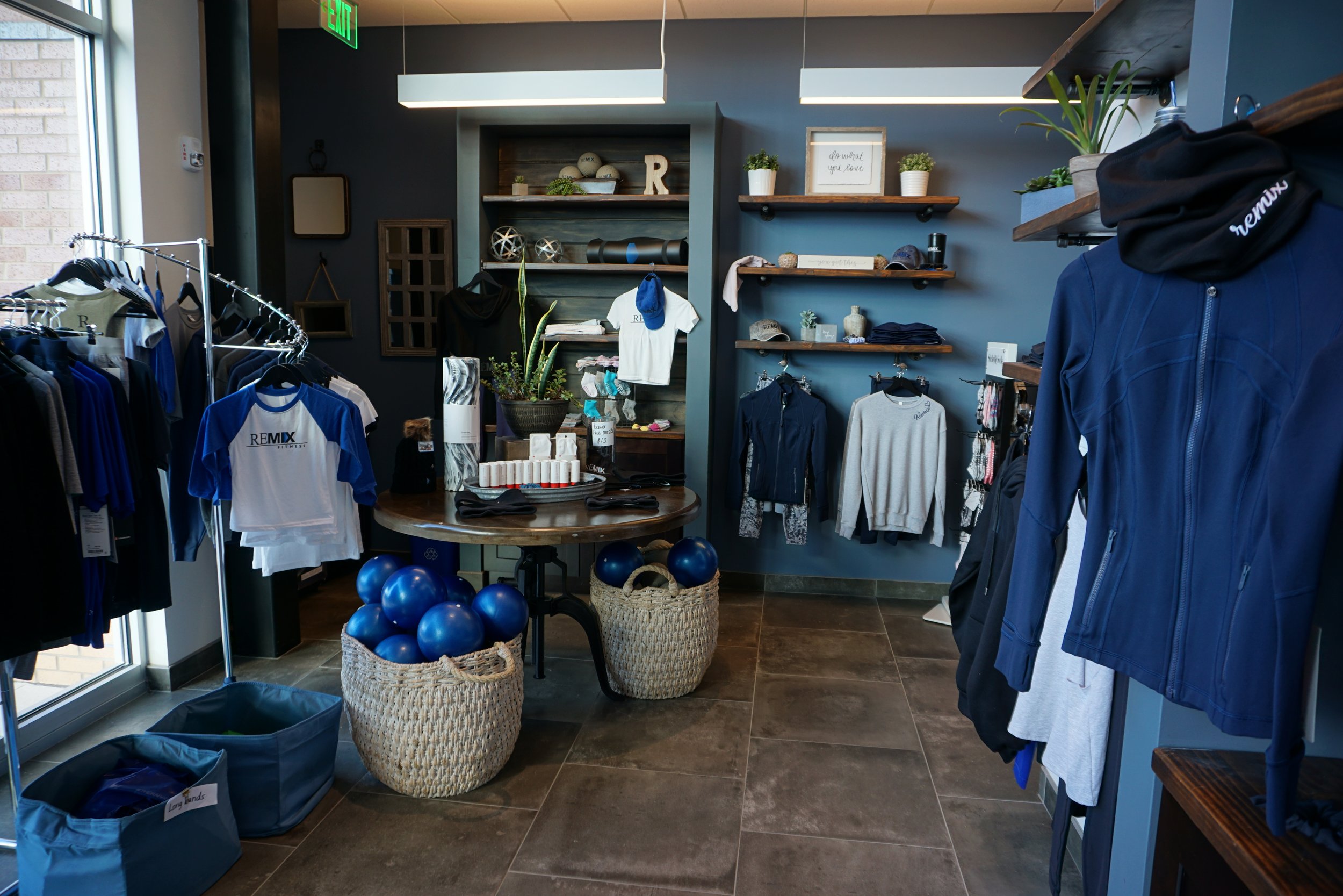 Come over before, during or after any of our classes to browse all of our athleisure wear and equipment, including our own Remix Branded items as well as Lululemon, stickybe brand, bala, and more. Select styles can also be found online below!
